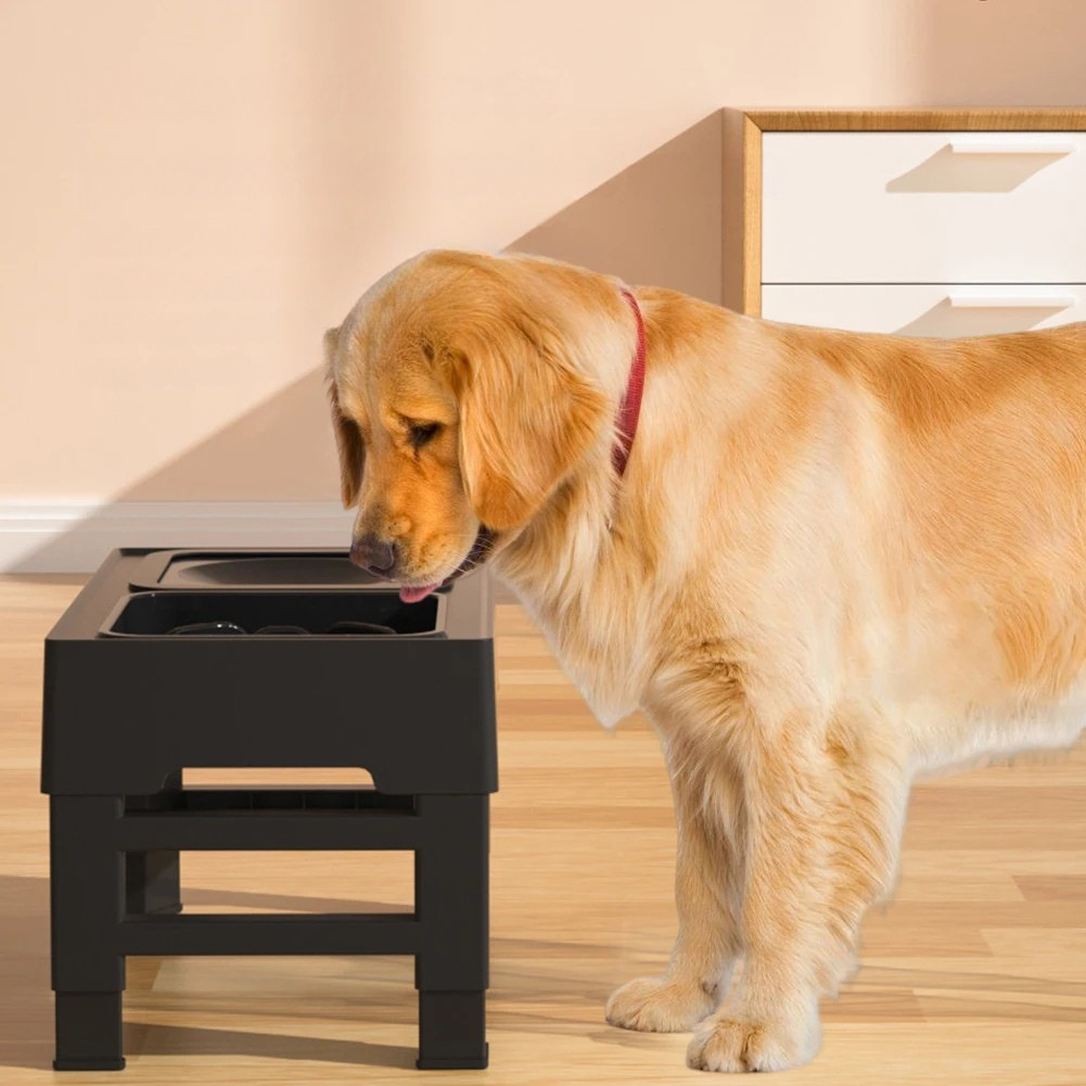Raised wooden dog feeding station with slow feeder and splash-proof water bowl—promotes healthy digestion, posture, and hydration for small to medium dogs.